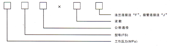 表示:工作壓力為0.6MPa,通徑DN=100mm,波數(shù)為20,法蘭連接的復(fù)式波紋補償器。