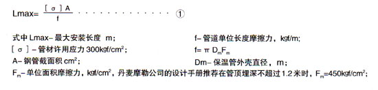 式中E-鋼管彈性模理,kgf/cm2;α-鋼管的線膨脹系數,取0.0133mm/m℃;△t-管道溫差;A、f-同公式①;L-兩固定點之間的距離(_安裝長度)m。 在實際工作中,直埋管道的熱伸長量,采用丹麥摩勒公司的簡化算法。