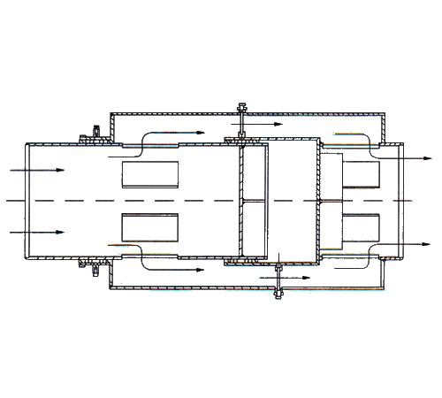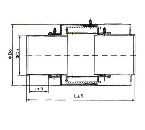 結(jié)構(gòu)特點是:采用三個填料密封箱;準確的設(shè)計一個封閉流體環(huán)腔,利用流體靜壓力產(chǎn)生對兩側(cè)管道的拉緊力,抵消管道拐彎或盲端處固定支架上作用的流體推力。這種結(jié)構(gòu),由于流體直通式流懂,所以流體阻力損失很小,安裝長度短。
