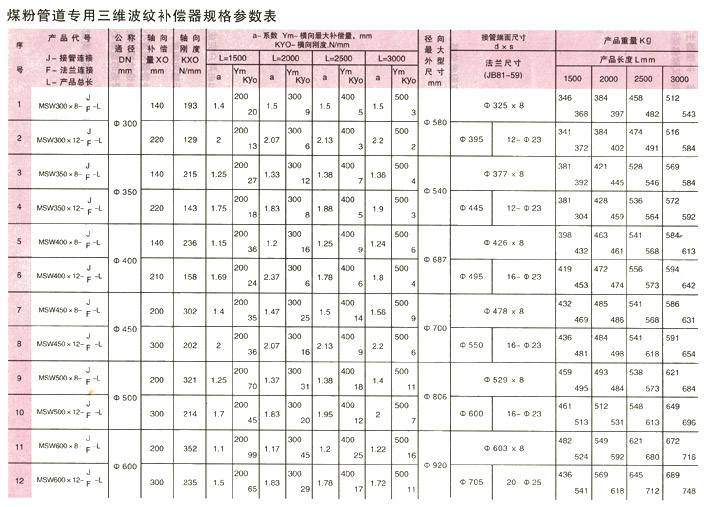 煤粉管道專用三維波紋補(bǔ)償器規(guī)格參數(shù)表