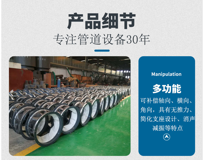 4、無反推力:由于柔性非金屬膨脹節(jié)/非金屬伸縮節(jié)主體材料為纖維織物,無力的傳遞。用非金屬補(bǔ)償器/纖維補(bǔ)償器可簡化設(shè)計(jì),避免使用大的支座,節(jié)省大量的材料和勞動(dòng)力。